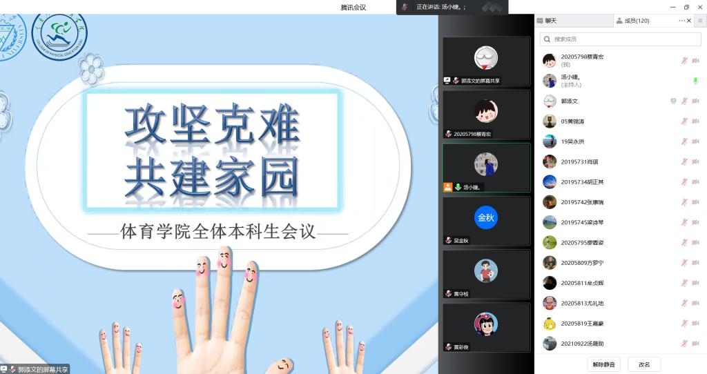11月17日,禁忌书屋 2022级召开了主题为“共克时艰 抗击疫情”的主题班会,本次班会由辅导员汤婕老师主持,2022级体育教育专业全体本科生参加。本次会议采取线上会议的形式进行。首先,汤婕对竹园五栋的同学们进行了解封后的安全提醒:出行必须佩戴口罩,保持一米社交距离,勤洗手等等。并告诉同学们,一定要勤加锻炼身体,保持身体健康。汤婕对此会议进行了录制,并转发给部分在外因特殊原因未能参会的同学。同时,学院给同学们发...
