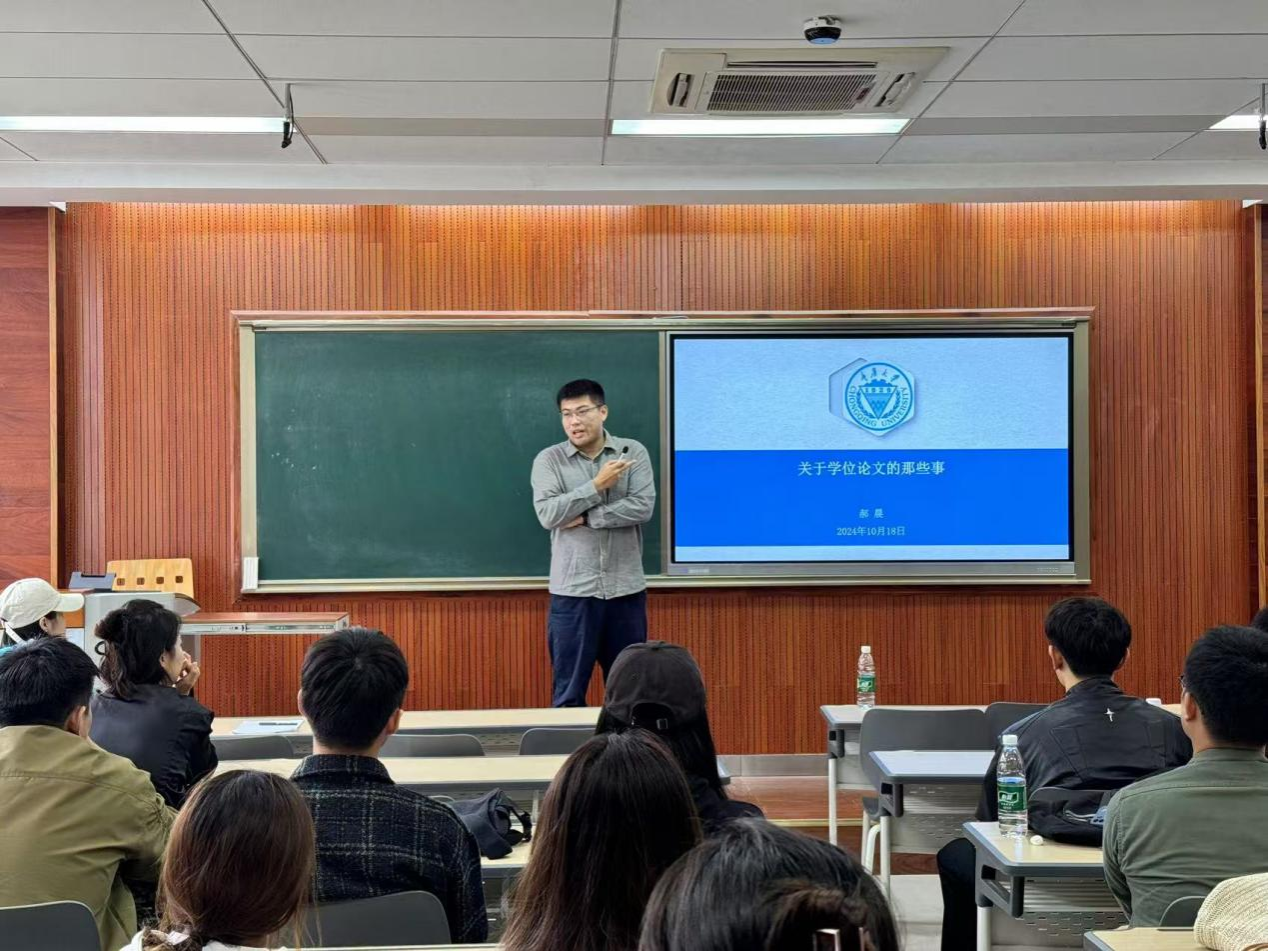 随后,郝晨老师从学位论文的基本概念入手,详细阐述了论文的选题、撰写、修改等各个环节的要点和注意事项。他结合自己的经验和生动的案例,深入浅出地讲解了论文写作中的常见问题和应对策略,让同学们受益匪浅。讲座过程中郝老师与同学们积极互动,耐心解答大家提出的问题,赢得了同学们的阵阵掌声。