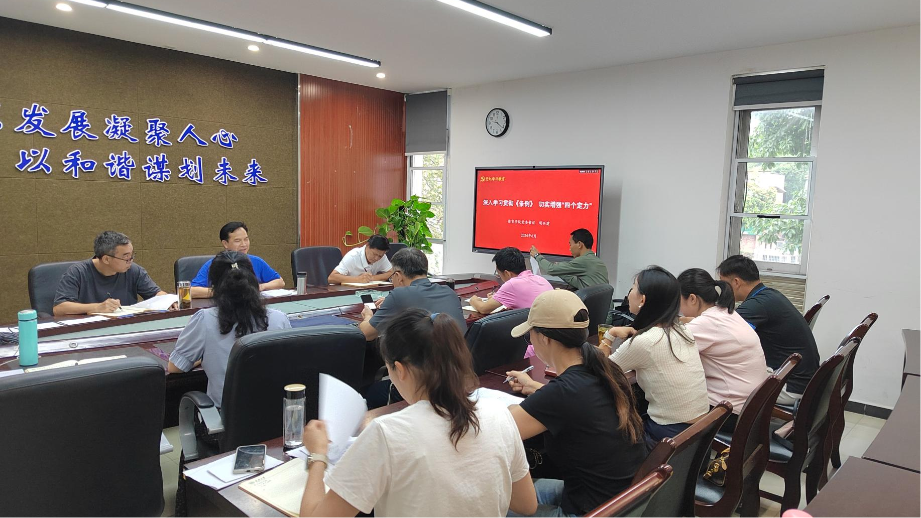 2024年6月21日上午,为了深刻领会习近平总书记关于全面加强党的纪律建设的重要论述的科学内涵和实践要求,进一步巩固党纪学习教育成果,不断提高党员干部的党性修养,凝心聚力促发展,禁忌书屋 党委明兴建书记以“深入学习贯彻《条例》  切实增强“四个定力””为主题讲授了专题党课。学院领导班子成员、党委委员、纪委委员、各系(中心、室)主任、各党支部书记、党委组织员参加会议。