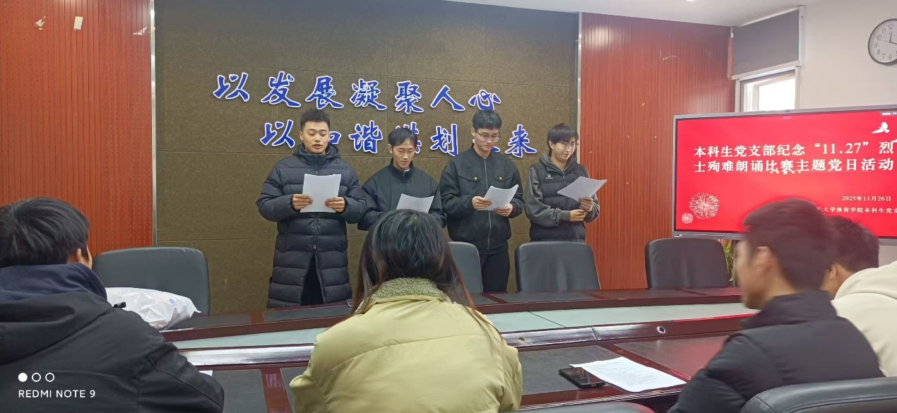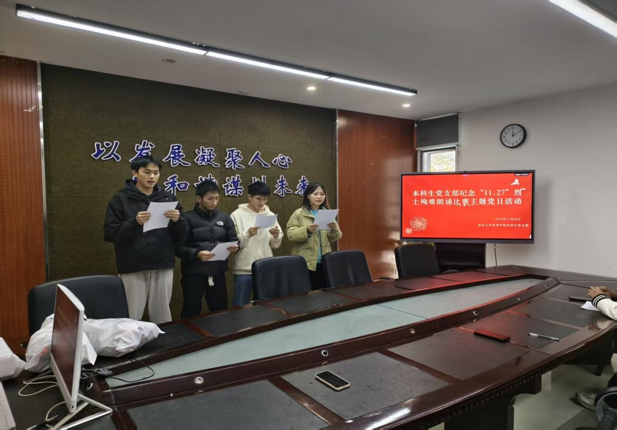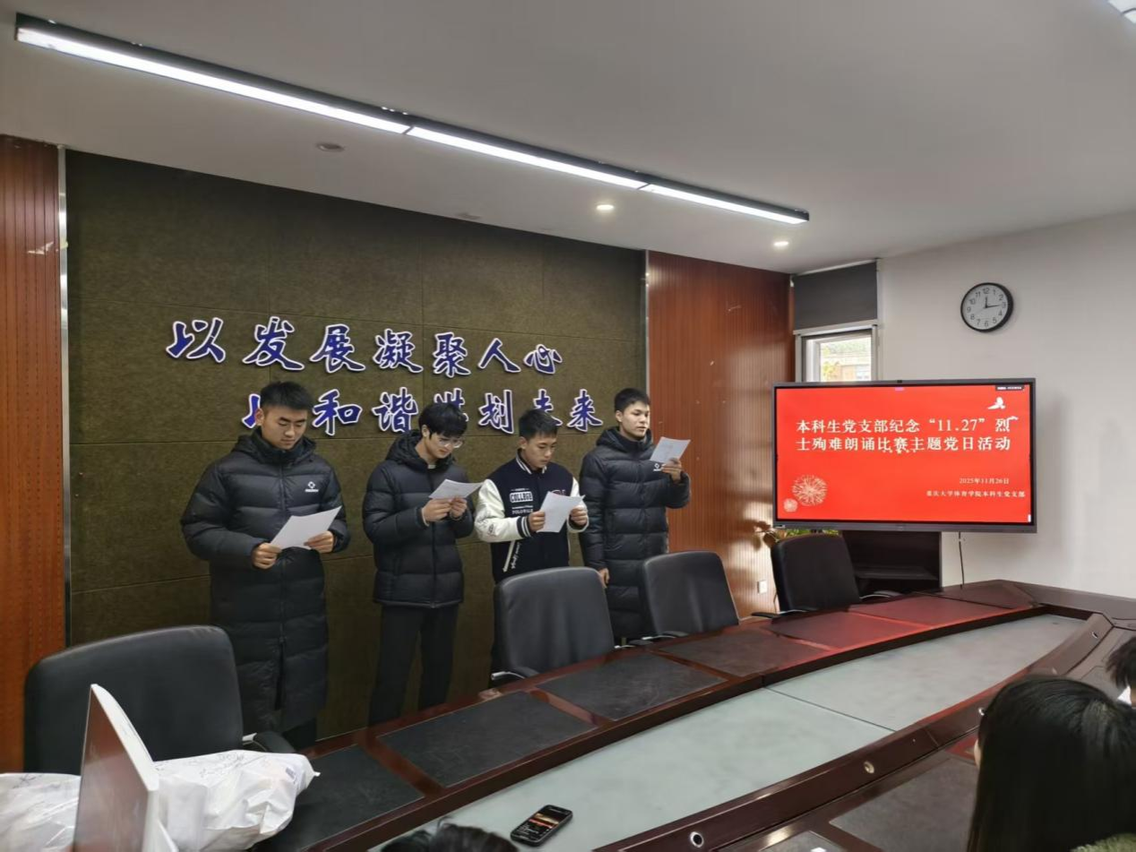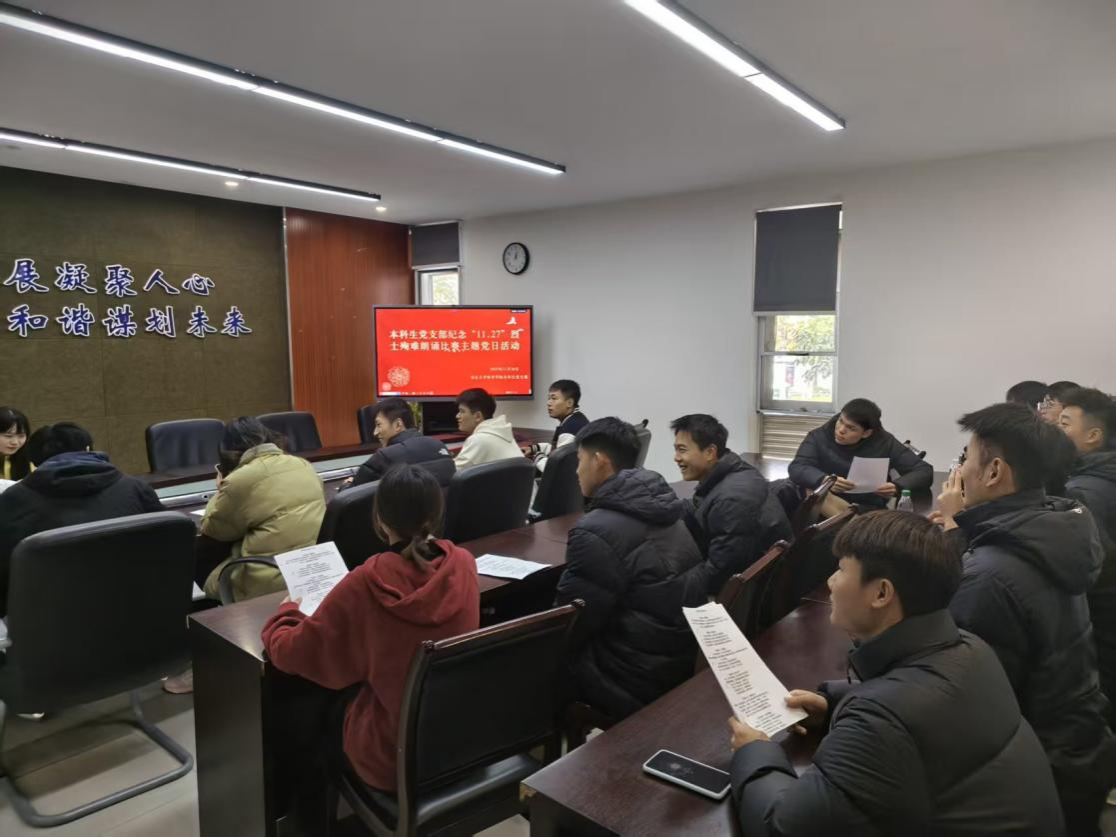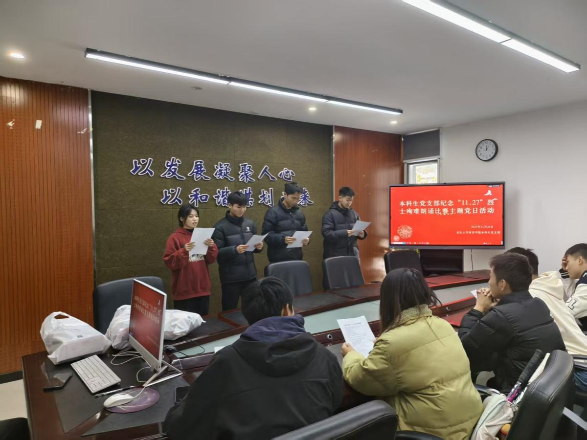 本科生党支部在学院211会议室举行了纪念“11.27”烈士殉难朗诵比赛主题党日活动,全体本科生党员参加。