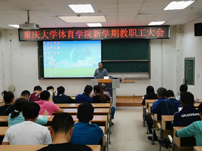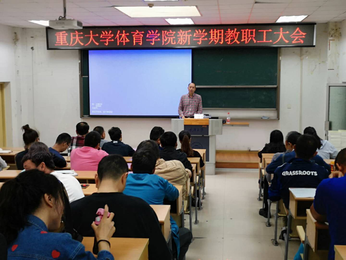 接着,许定国院长对本学期学院的重点工作做了说明,并向大家通报了学院近期的重要工作。他指出,上学期期末学院完成硕士生导师招生资格审核工作,学院目前共有14位研究生导师。暑假完成虎溪校区学院办公楼一期的装修,本月底学院行政办公室将整体搬迁到虎溪校区。学院学科建设方面取得可喜的突破,学院新增省部级科研项目一项,厅局级科研项目一项,学院与生物工程学院联合成功申报国家自然科学基金一项。目前学院正进行本科生保研评审工作。为了学院工作更高效的运行,公共体育课教学组织有所调整。为便于学院更好运行,正着手对学院内部机构进行调整,学院内部机构进行调整之后将对教工党支部设置作相应调整,并完成各党支部的换届选举工作。并提醒各位老师,职称评审工作今年学校进行改革,申请职称评审的老师需在网上进行申报。对学院物资管理、办公用品、体育耗材的购买进行详细说明,确保学院物资采购合理、高效。对学院奖励绩效方案向全院教职工做了说明,更加明确了绩效考核分配制度的公平、透明。