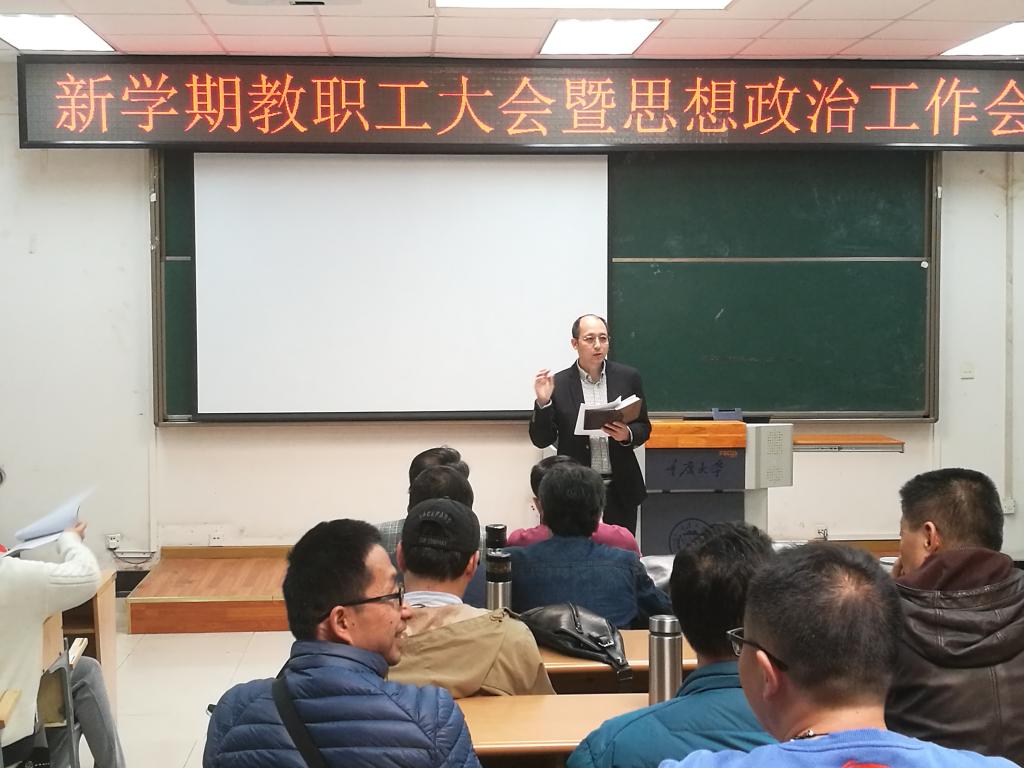 春风化雨,草长莺飞。新学期,新气象,新时代,新作为。2018年3月15日上午,学院新学期教职工大会暨思想政治工作会在阶梯教室召开。大会由学院党委书记许定国教授主持。