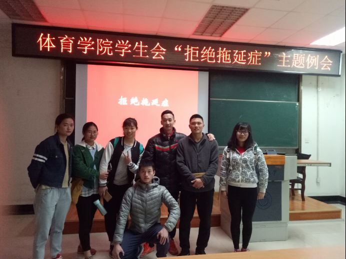 下午三点会议准时开始,本次会议由文体部部长卢宗其主持,会议开始,卢宗其为大家做了一个拖延程度的小测试,经过测试后,包桂冰,石化军,韩桂花,金开荣,曾凯为轻度拖延症,剩下的同学为中度拖延症,做完测试后大家依次分享了自己做过特别拖延的事,包括等校车的时候拖延,没有等到校车,记英语单词的时候拖延,到现在还没有记住多少,考驾照,教师资格证的时候拖延到现在考试还没有通过。每个人说完后包桂冰总结到,做事情的时候分清楚事情的轻重缓急,主次。说完后卢宗其给大家提出了几条调整拖延症的方法:1确立一个可操作的目标,而不是那种模糊而抽象的目标。2将你的目标分解成短小具体的迷你目标,每个迷你目标都要比大目标容易达成,小目标可以积累成大目标。3为困难和挫折做好心理准备。4留意你的借口,不要用习惯地借口来拖延。