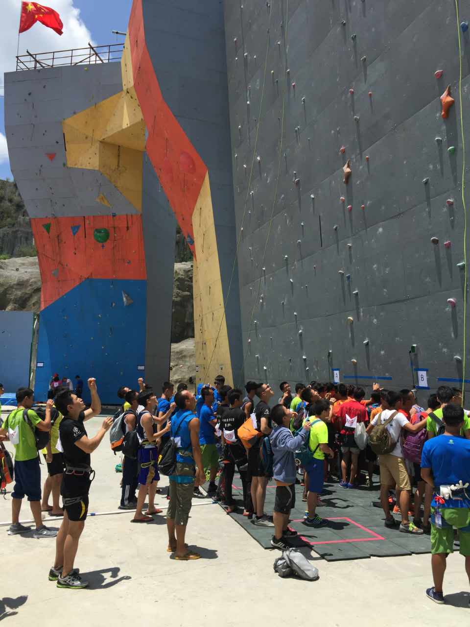 攀岩队在比赛中不断前行,向着更高、更强、更快的体育精神迈进。