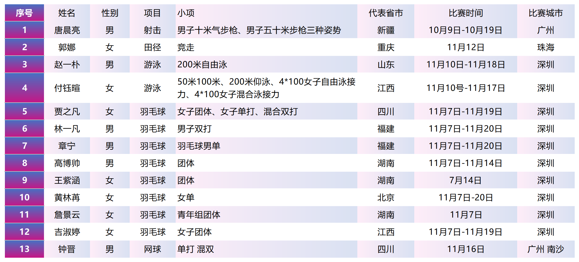 11名优秀学子与2名青年教师已凭借出色的竞技水平和扎实的训练成果,成功获得全运会决赛阶段的入场券,将代表多个省市出征这一全国体育盛会,在赛场上展现重大人的飒爽英姿。