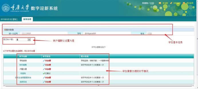 研究生新生在页面查看各个环节办理情况(各个环节办理,无先后顺序,可以并行办理),如下图: