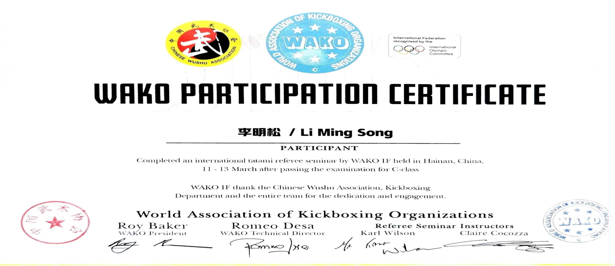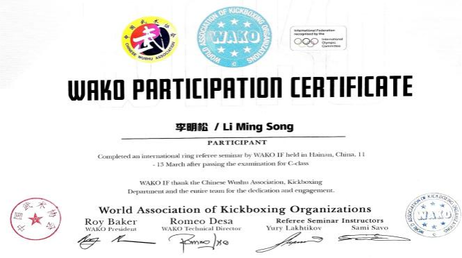 体育学院的李明松老师成功晋级自由搏击国际级裁判员,成为中国第一批获得由世界自由搏击联合会(WAKO)、国家体育总局武术管理中心和中国武术协会联合认证的自由搏击国际级裁判资格的资深武术搏击工作者。世界自由搏击联合会(WAKO)是国际奥委会、国际单项体育联合会唯一承认的自由搏击国际单项组织。本次培训及考核通过的学员名单由世界自由搏击联合会(WAKO)、国家体育总局武术运动管理中心、中国武术协会联合公示认证。