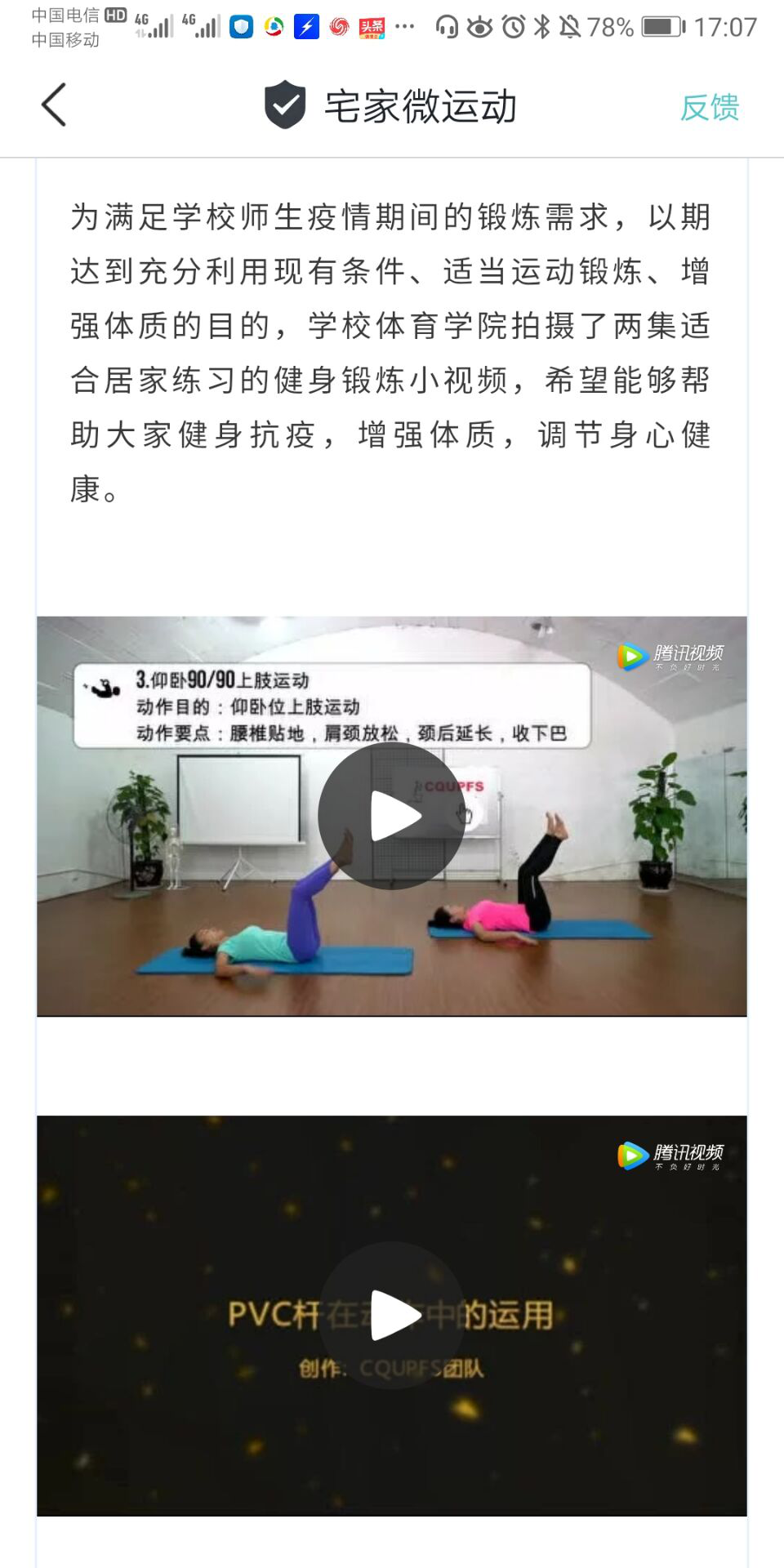 组织制作的运动视频在“今日校园”APP“疫情防控”板块“宅家微运动”上线,深受广大师生喜爱。