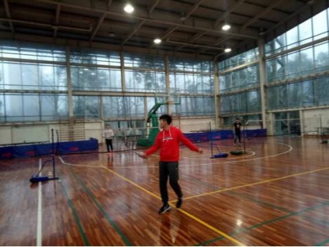 羽毛球专项队为每周早晨三练,6点四十准时到达体育馆开始训练(挥拍练习、步伐练习等)