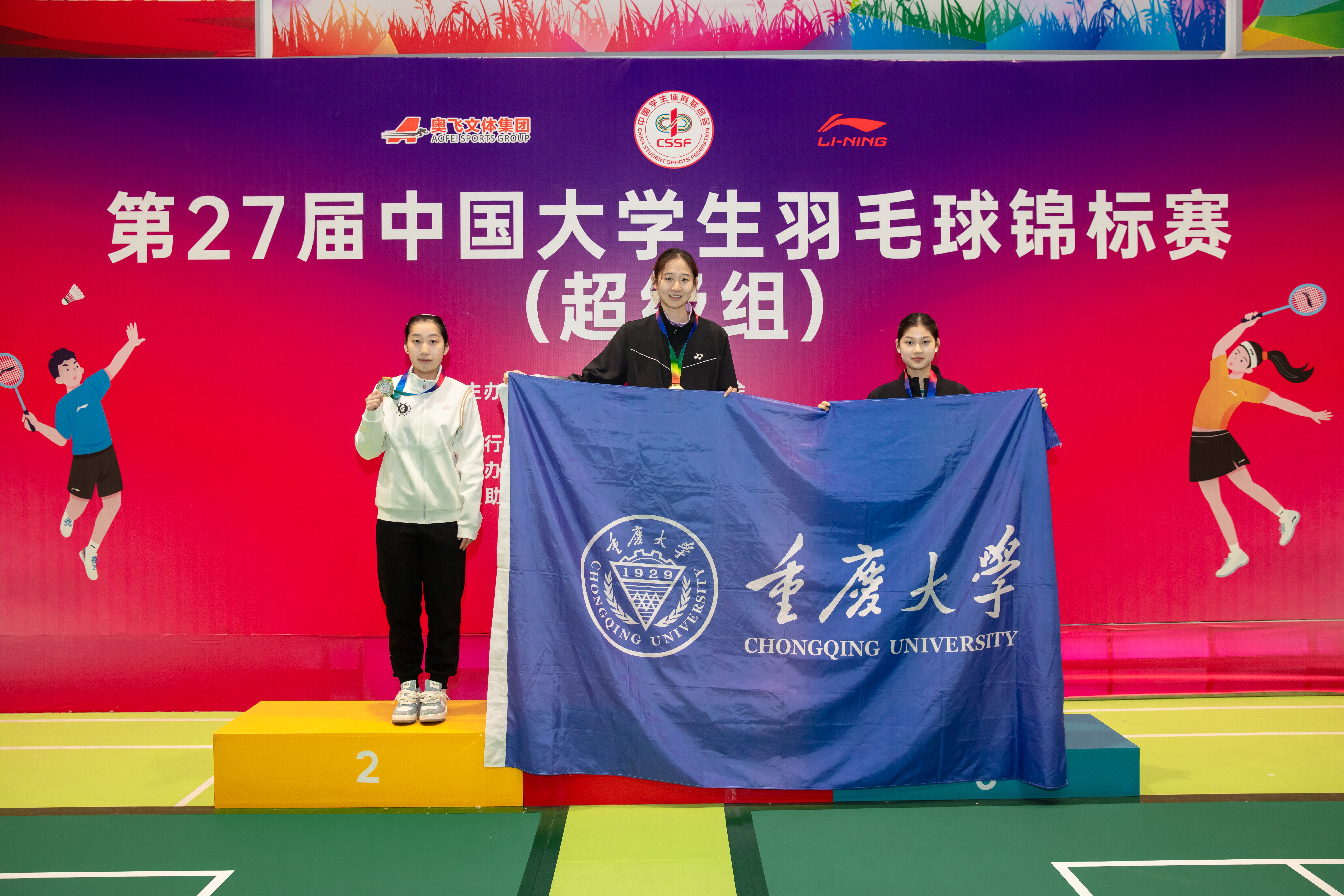 女单赛场成为重大学子闪耀的舞台。贾之凡同学在决赛中沉着冷静,以 21:10, 21:19 直落两局,战胜西南大学的赵显雯,强势摘得女单桂冠。王紫涵同学则在季军争夺战中展现出强大的进攻火力,以 21:3, 21:6 的悬殊比分战胜浙江大学的刘戴茵,将铜牌收入囊中。一金一铜,彰显了我校在女子单打项目上的强劲实力。