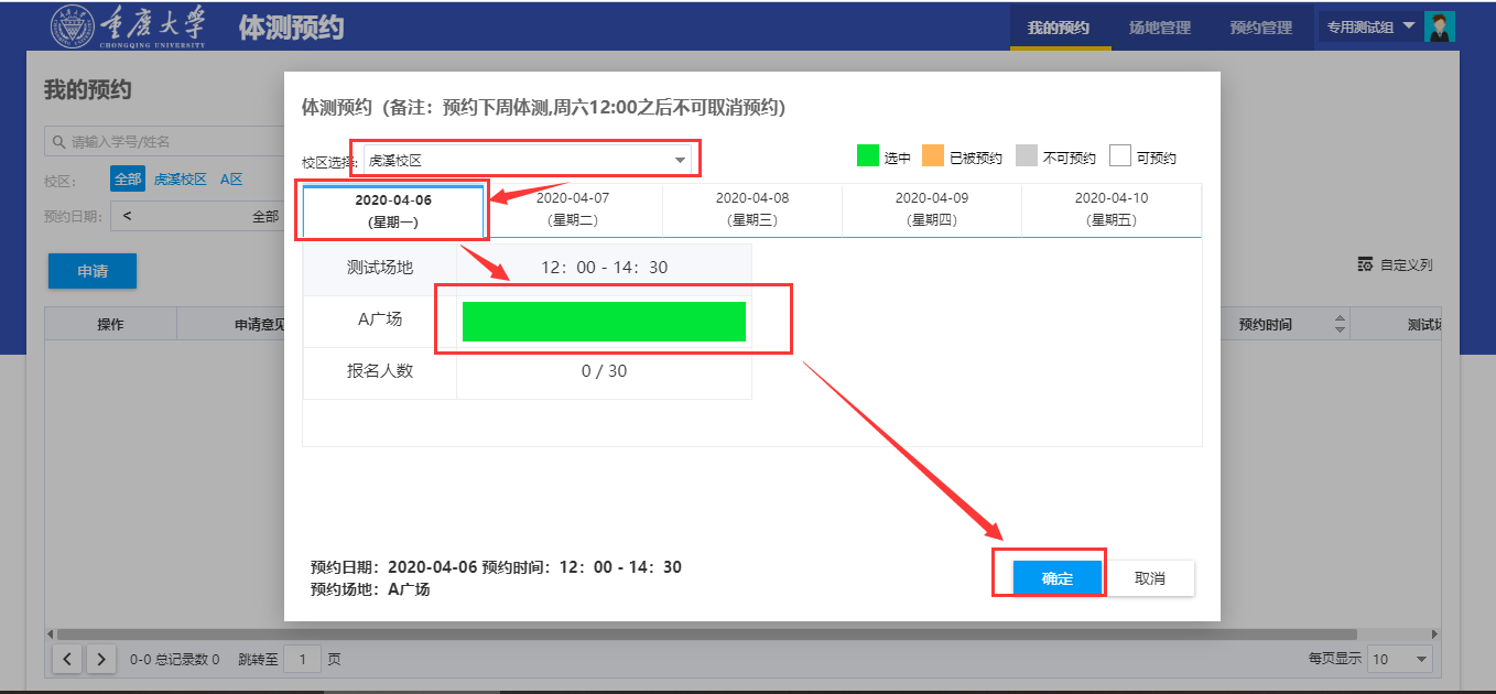 (2)点击申请,选择校区、星期,选中测试场地,点击“确定”进入下一步,如图所示: