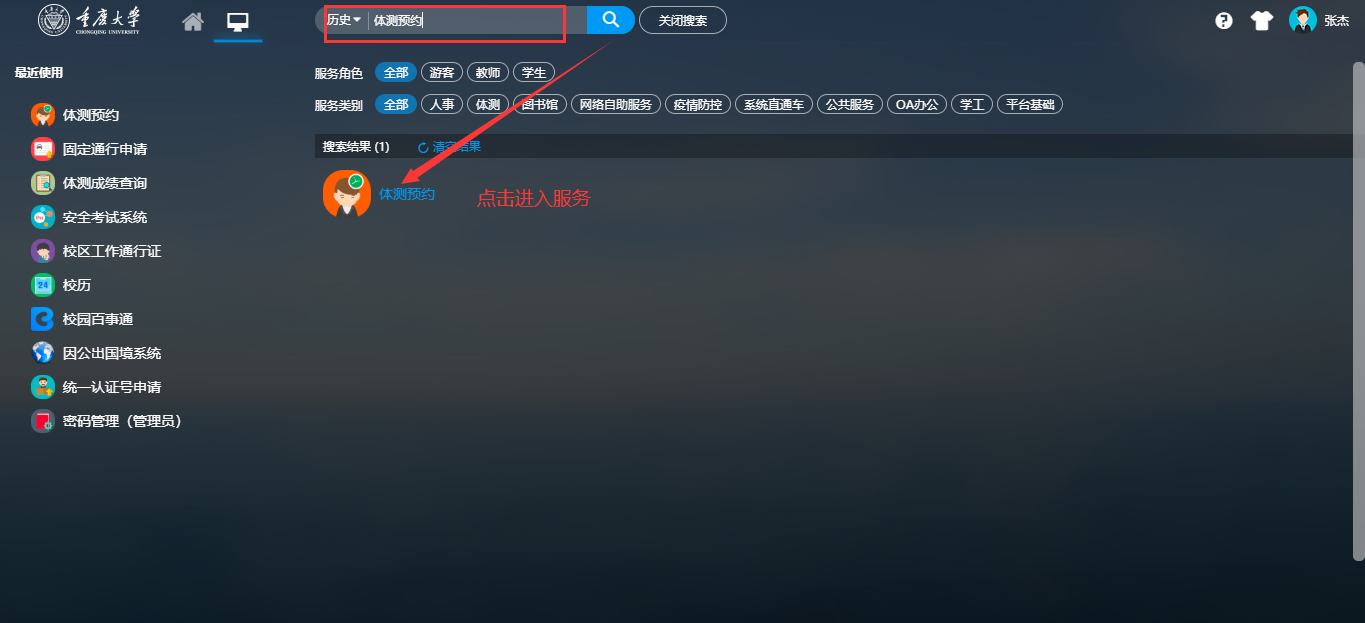 (2)进入网上服务大厅,在顶端搜索框内输入“体测预约”,点击应用进入服务,如图所示: