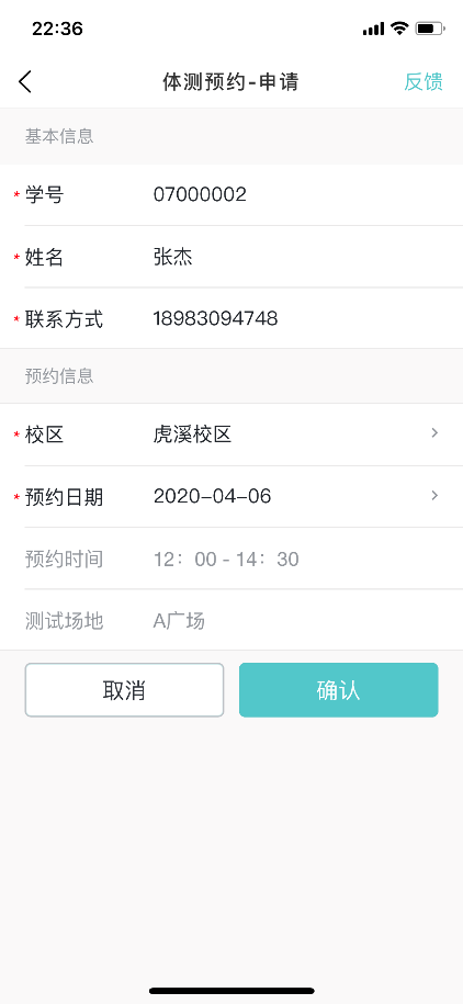 (4)“我的预约”页面增加一条体测预约记录,在体测管理老师没有确认前,可以取消预约,如图所示: