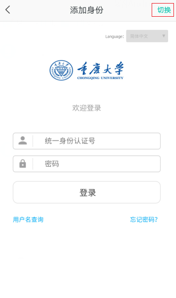 (3)点击右上角的【切换】选择对应的学校名称(禁忌书屋 ),已经是禁忌书屋 的直接输入账号/密码(学号和统一认证号的密码),点击登录