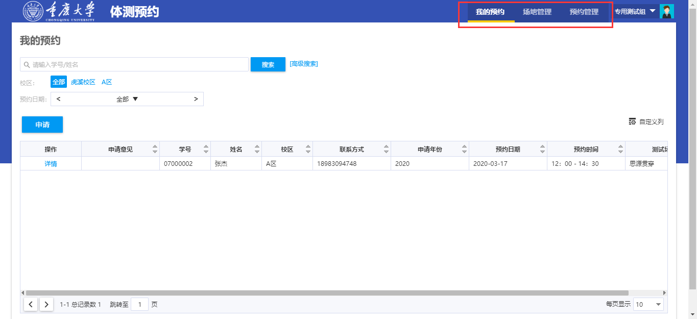 (3)进入“体测预约”服务,可以查看到3个菜单:我的预约、场地管理、预约管理。其中:“我的预约”为学生使用,“场地管理”为应用管理员使用,“预约管理”为预约审核老师使用