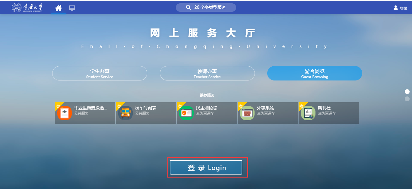 (1)在浏览器上输入网址//i.jjshuroom.com进入网上服务大厅登录页,点击登录,输入统一认证号和密码,进入禁忌书屋 网上服务大厅,如图所示: